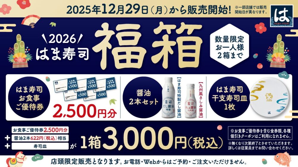 2026年はま寿司の福箱は、2025年12月29日(月)~店頭にて購入することができます。
