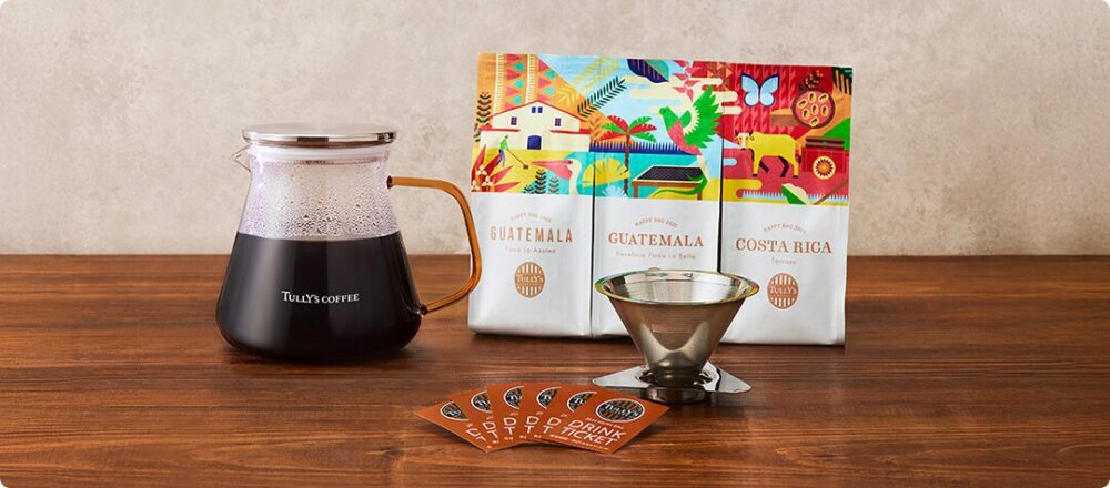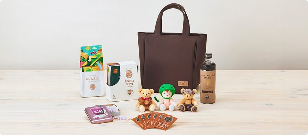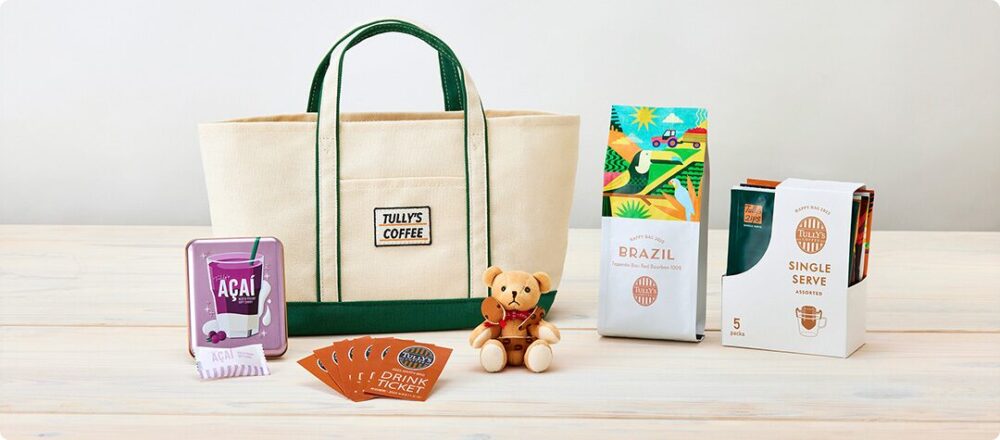 | 内容 | ・セカンドトートバッグ(モカ) ・ブラジル ファゼンダバウ レッドブルボン100%(粉)140g ・シングルサーブ5種 アソートBOX ・Tully’s Specialty カフェオレベース 300ml ・アサイー&ヨーグルト ソフトキャンディ ・干支ミニテディ(巳年)※3種のうちいずれか1個 ・ドリンクチケット 6枚 |
