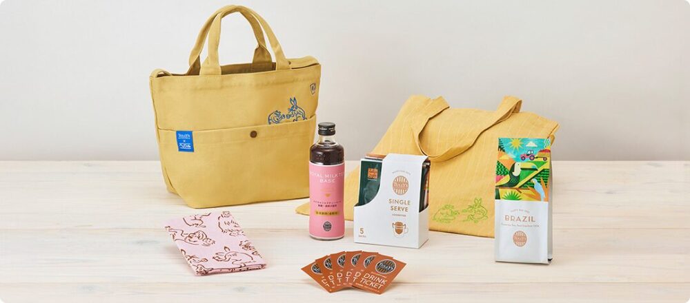 | 内容 | ・鳥獣戯画 ポケットトートバッグ(若菜色) ・ブラジル ファゼンダバウ レッドブルボン100%(粉)140g ・シングルサーブ5種 アソートBOX ・ロイヤルミルクティーベース 300ml ・鳥獣戯画 クルクルトートバッグ(ベージュストライプ or イエローストライプ) ・タリーズ手ぬぐい鳥獣戯画 ちょっと一息(ピンク or マスタード) ・ドリンクチケット 6枚 |